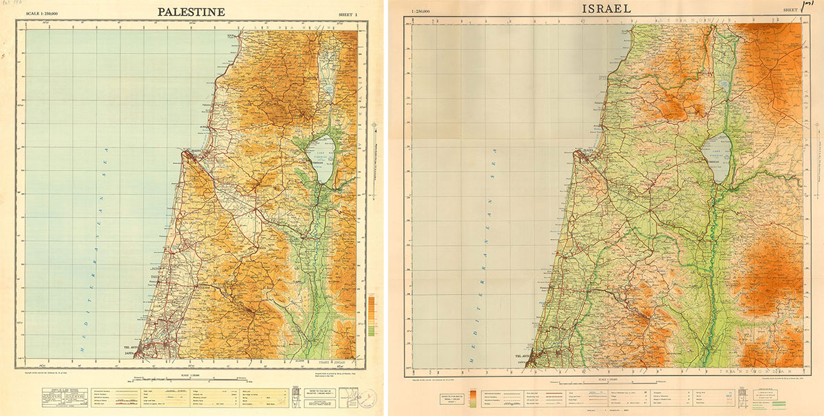 Left: 1946 “Palestine” map sheet at 1:250,000 scale, produced by the British mandate “Survey of Palestine”. Right: 1951 “Israel” map sheet produced by the “Survey of Israel” based on the earlier map.